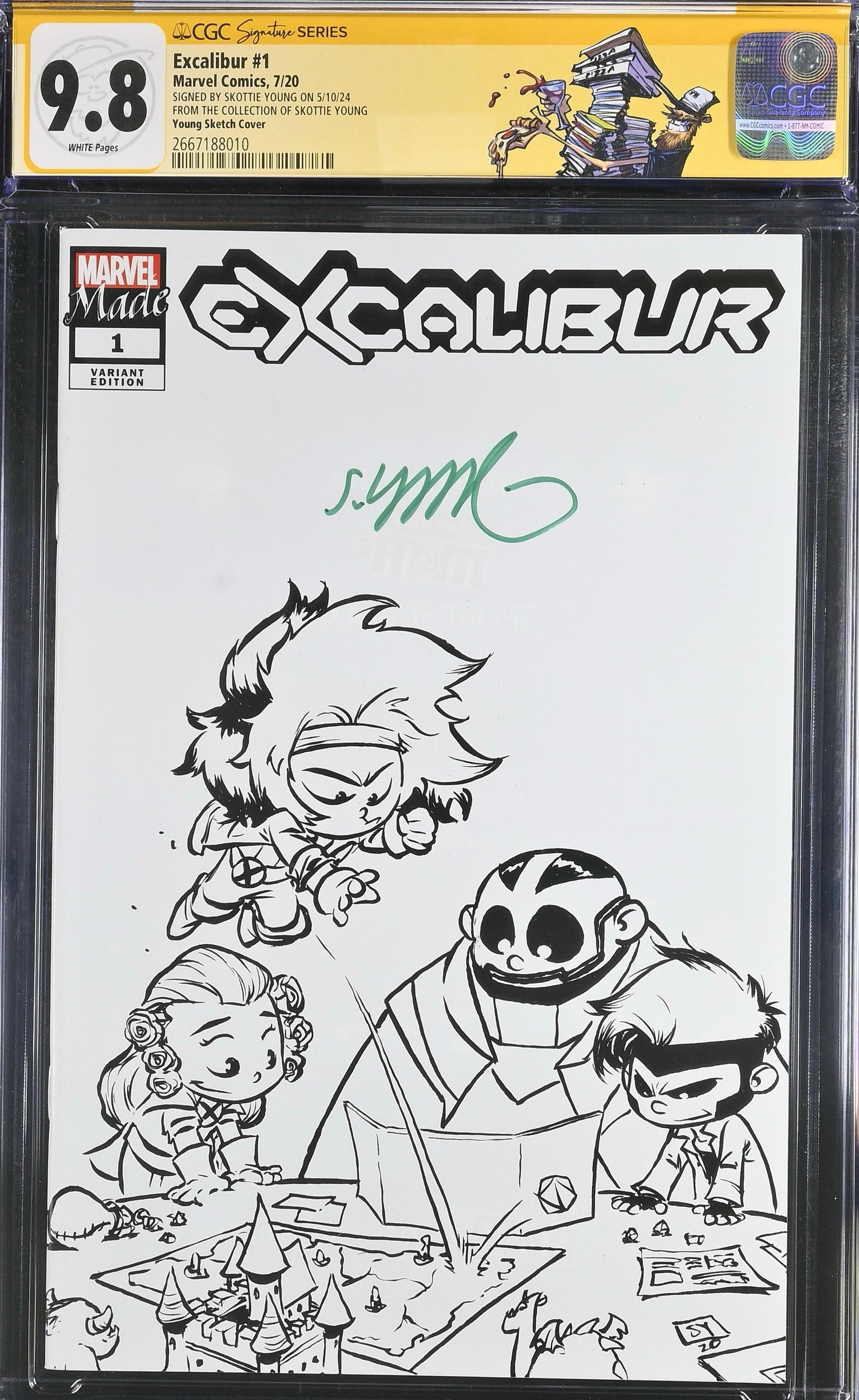 Skottie's cover for Excalibur #1 was part of of the 2019 Marvel Made pin set. The black & white sketch cover was only available to the first 1,000 ordered. Only 7 books in the CGC census and this is the ONLY one with Skottie's Personal Collection label!