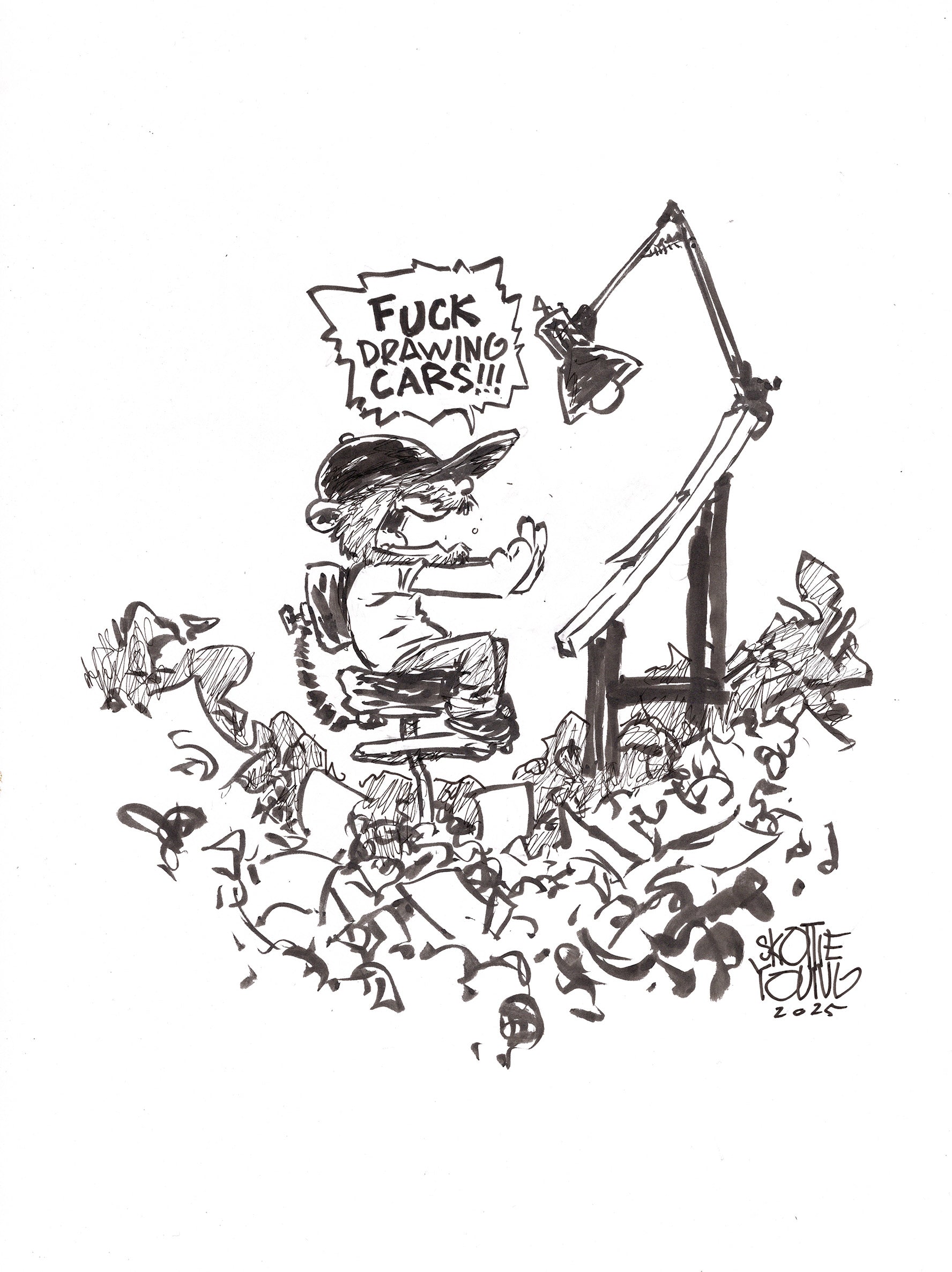 Skottie is sourcing a list of one word prompts for a daily sketch. CAR is the word for Dec 10, 2025. Today's art is a 9X12 Ink on bristol.