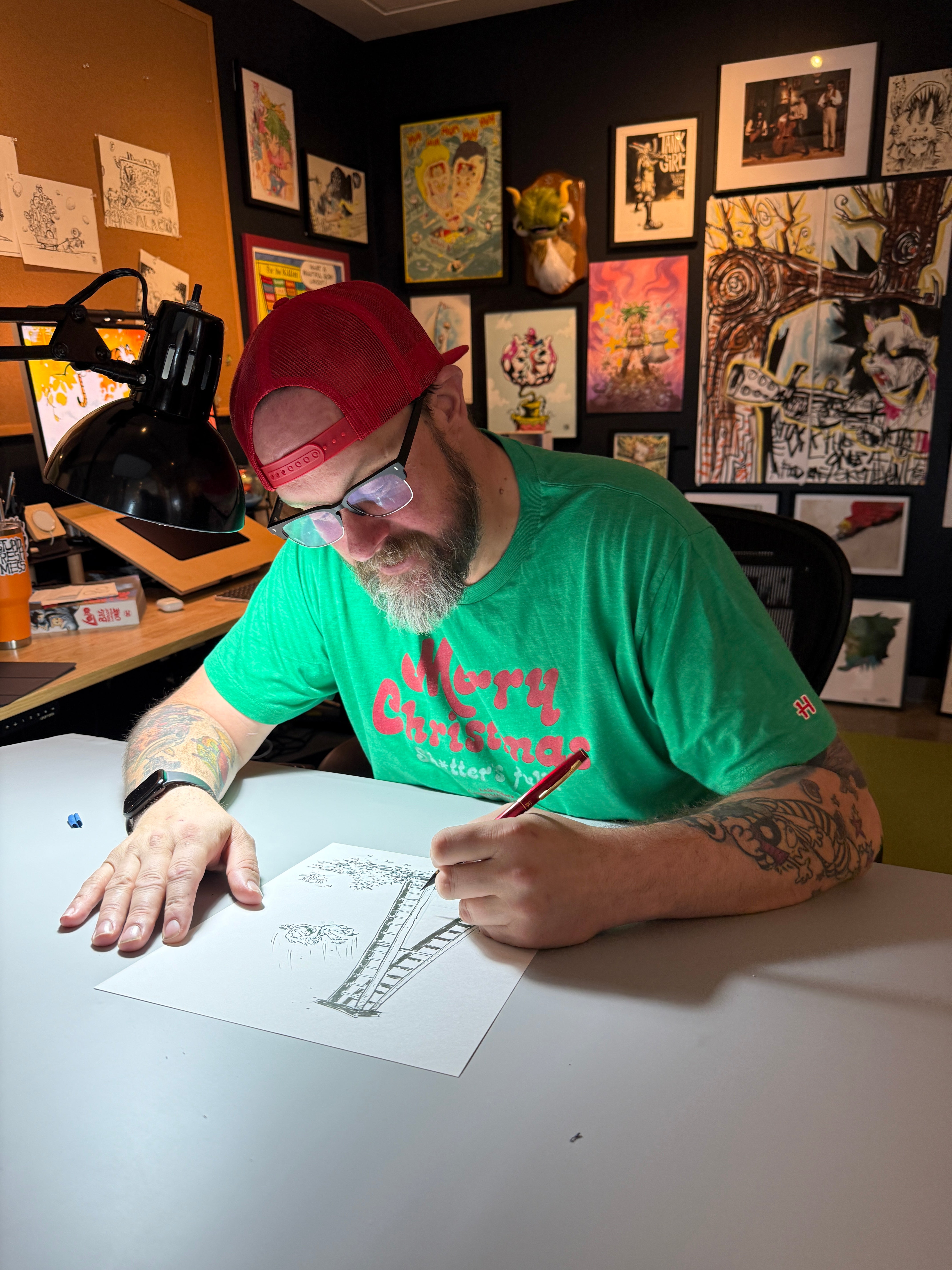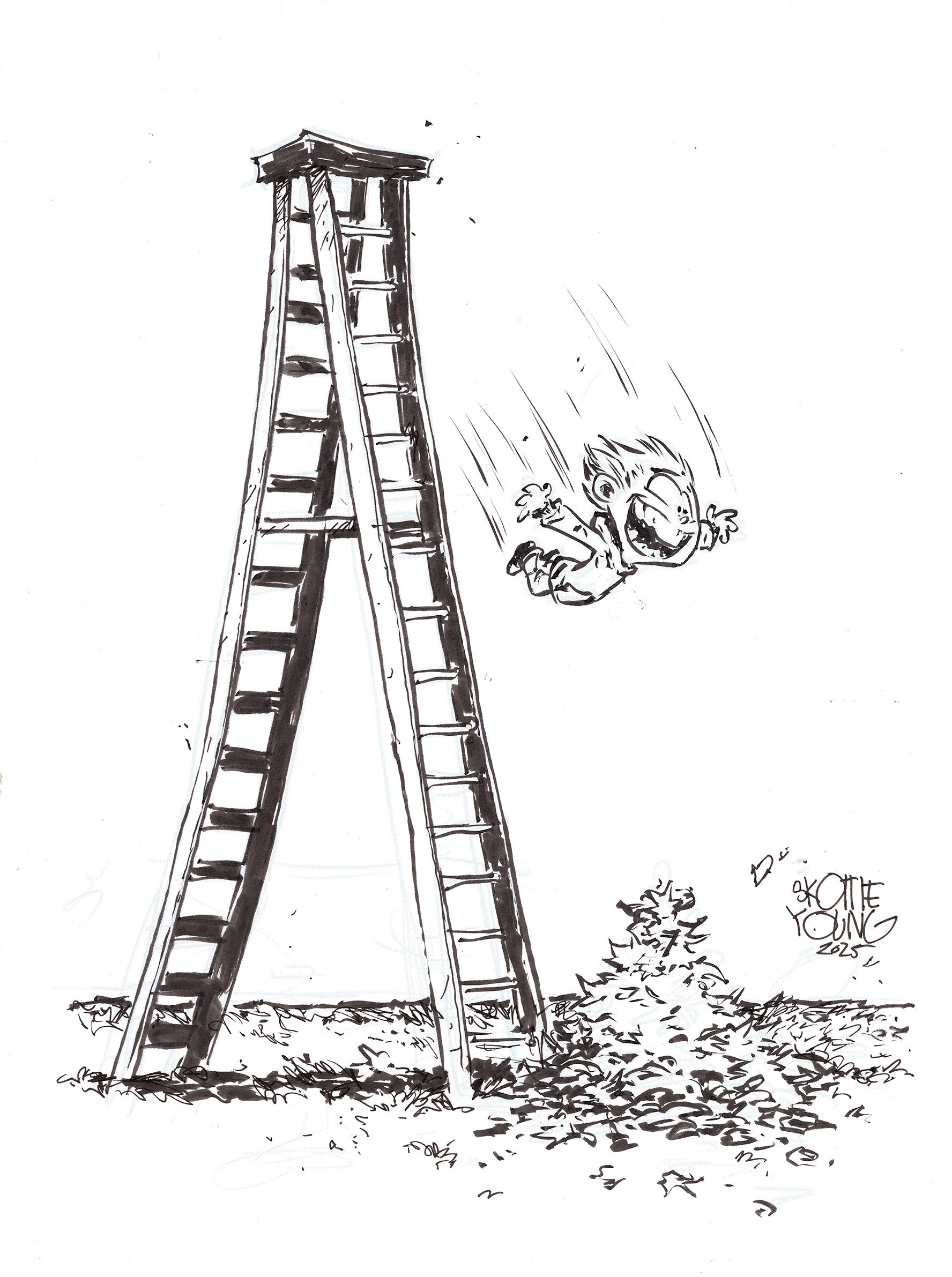 Skottie is sourcing a list of one word prompts for a daily sketch. LEAF is the word for Dec 2, 2025. Today's art is a 9x12 piece. Ink and on bristol.