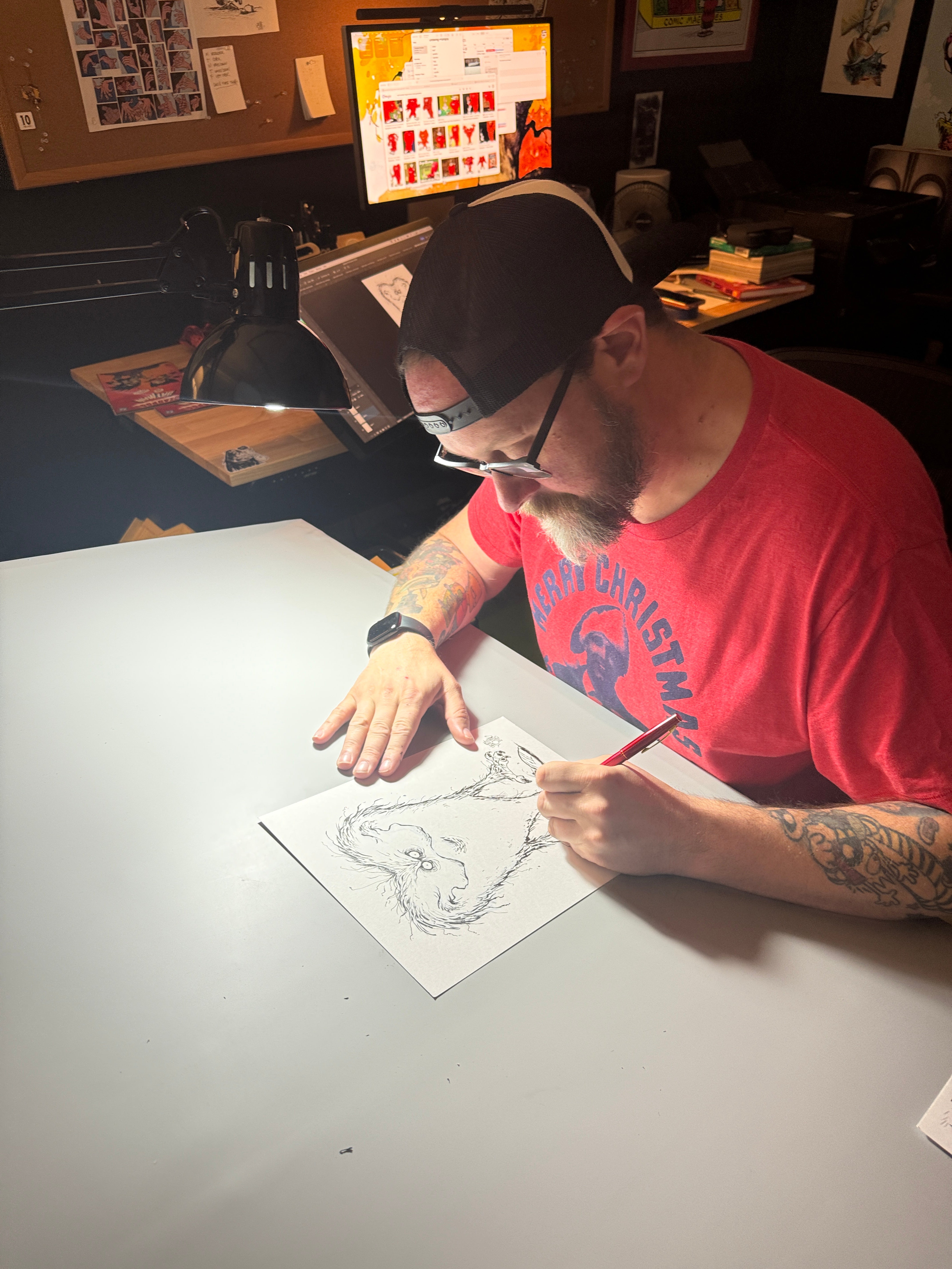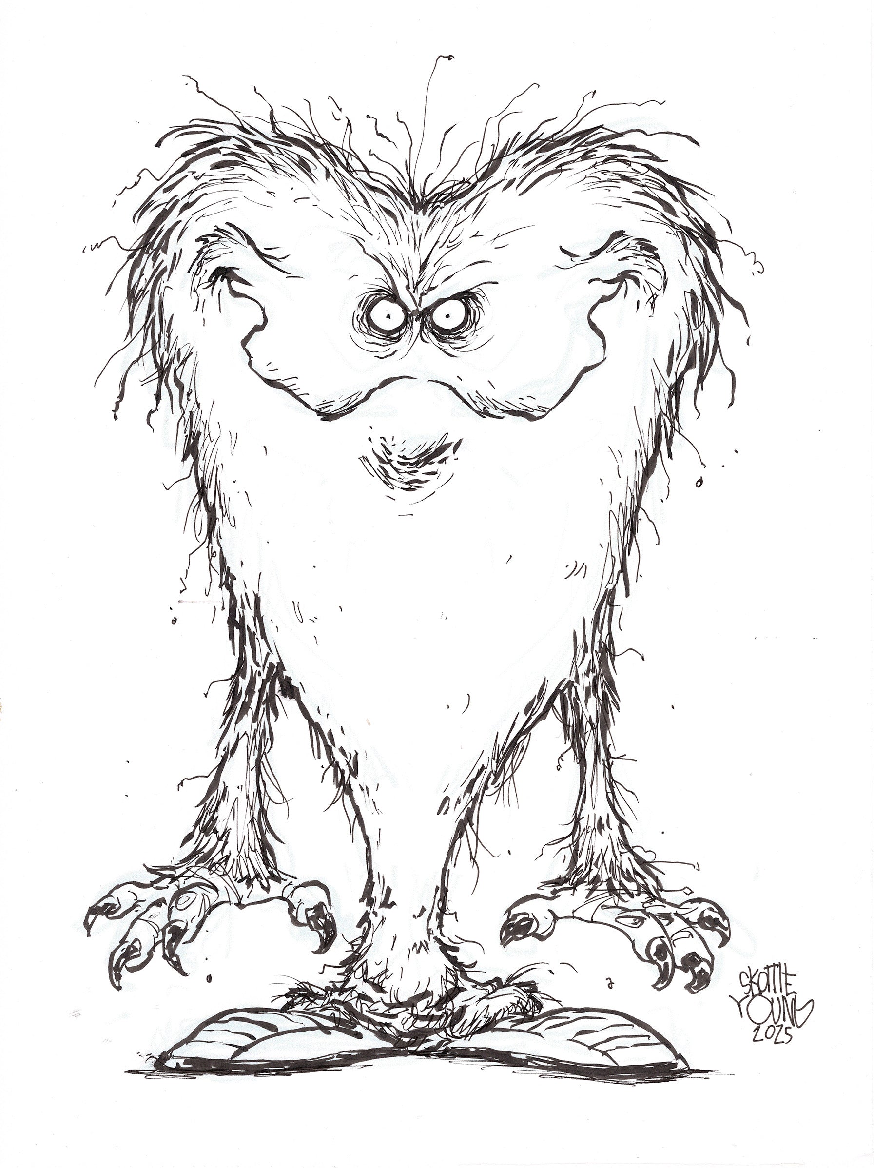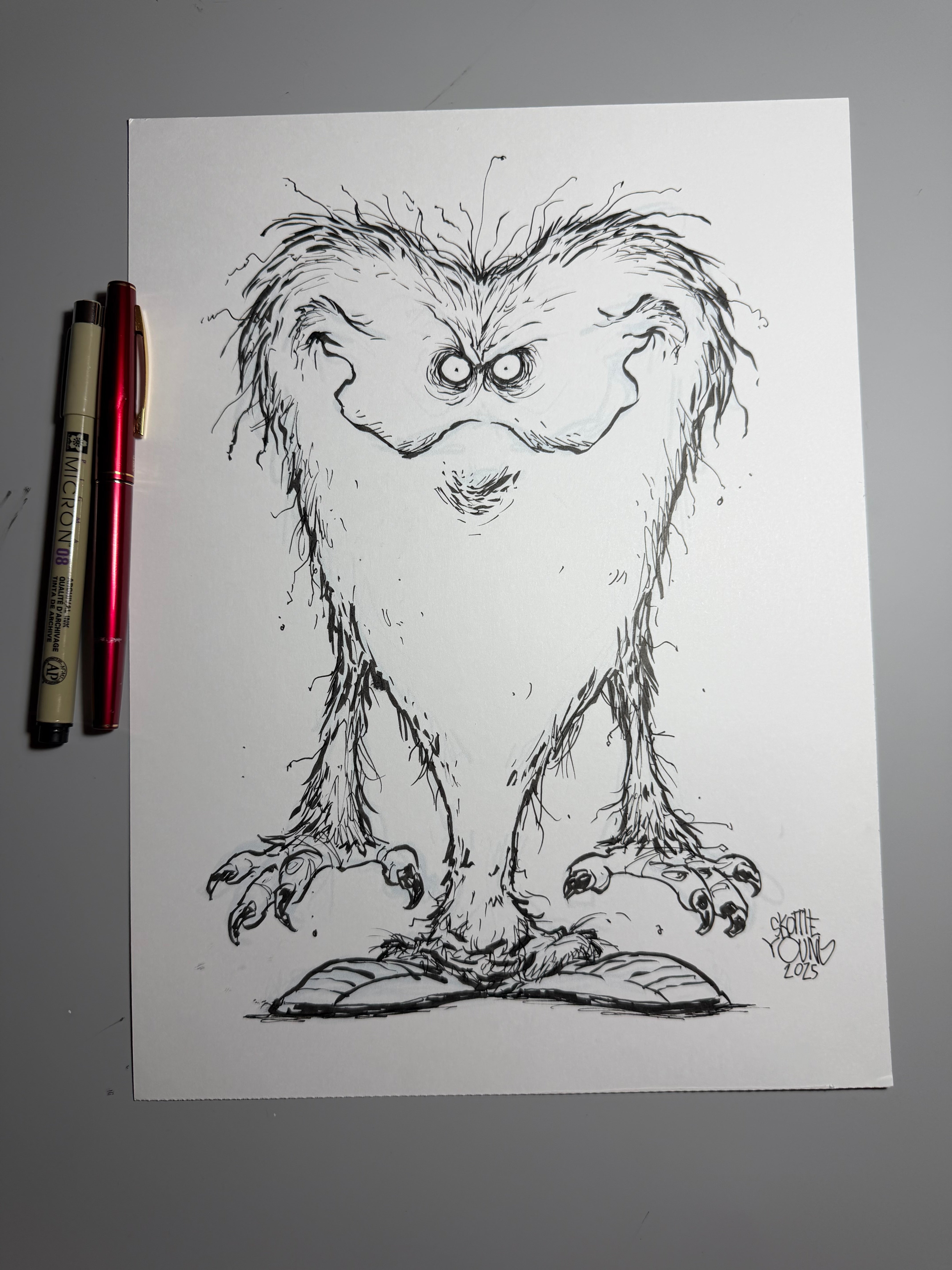 Skottie is sourcing a list of one word prompts for a daily sketch. SHOE is the word for Dec 1, 2025. Today's art is a 9x12 piece. Ink and on bristol.